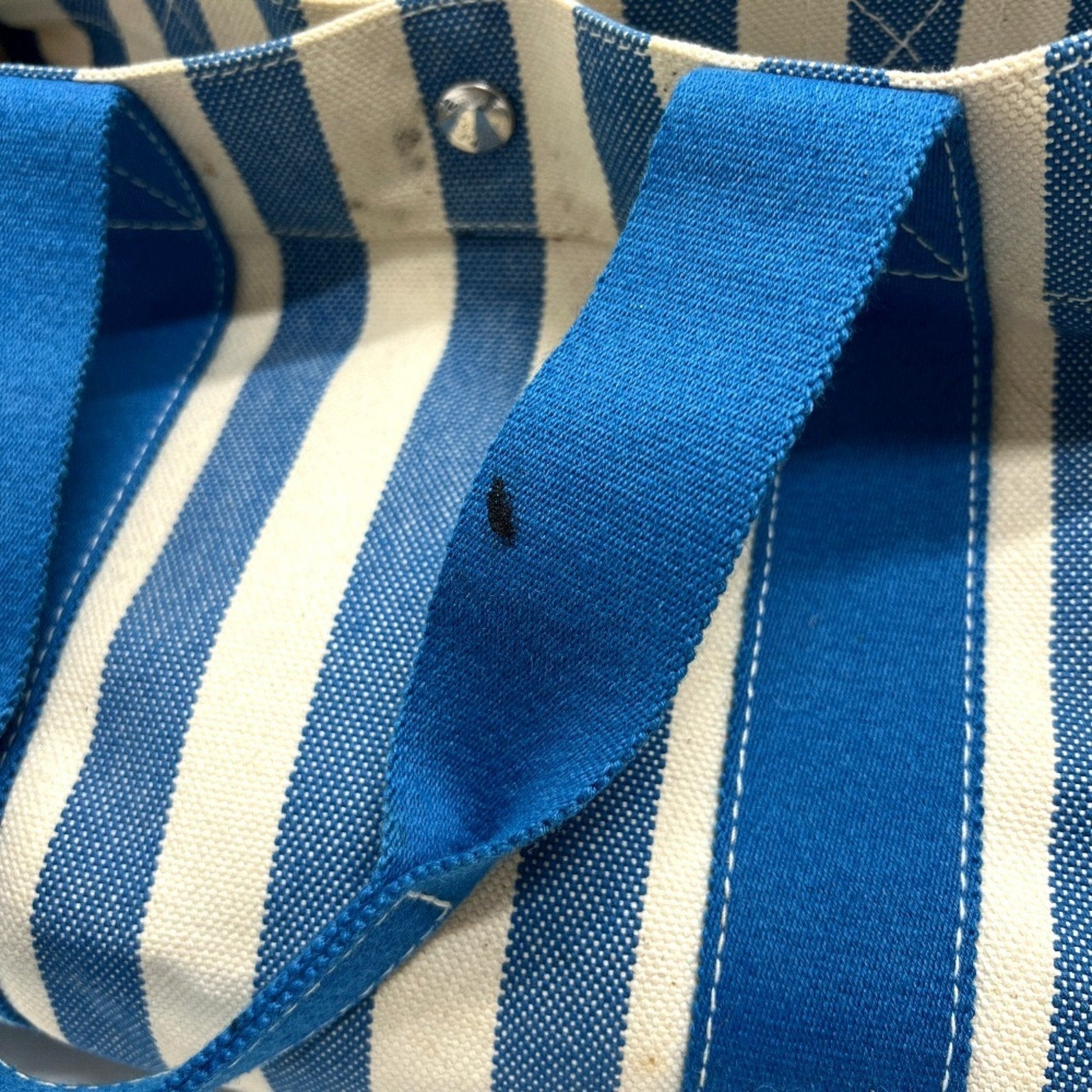 Brand: Hermes, Color: Blue, White, Yellow, Material: Canvas, Dimensions: 21cm x 40cm x 30cm / 8.26'' x 15.74'' x 11.81'', Condition: Rank B. Rank B Used - Traces of usage, damages / dirt can be seen but it is still in acceptable condition for continued usage. Before purchasing, please refer to the images for the exact condition of the item. Before purchasing, please refer to the images of the accessories included with the item. Bag Common Damage Scratch: Moderate
