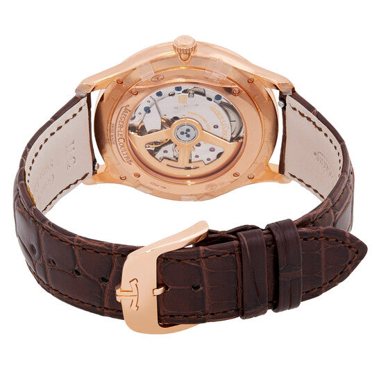 18kt rose gold case with a brown leather strap. Fixed rose gold-tone bezel with diamond set. Champagne dial with rose gold-tone hands and index hour markers. Minute markers around the outer rim. Dial Type: Analog. Date display 6 o'clock position. Jaeger LeCoultre Calibre JLC 899/1 Automatic movement, containing 32 Jewels, composed of 219 parts, bitting at 28800 vph, and has a power reserve of approximately 38 hours. Scratch resistant sapphire crystal. Screw down crown. Transparent see through case back. Round case shape, case size: 39 mm, case thickness: 7.8 mm. Buckle clasp. Water resistant at 50 meters / 165 feet. Functions: date, hour, minute, second. Master Ultra Thin Series. Luxury watch style. Watch label: Swiss Made. Jaeger LeCoultre Master Ultra Thin Automatic Champagne Dial Men's Watch Q1232501.