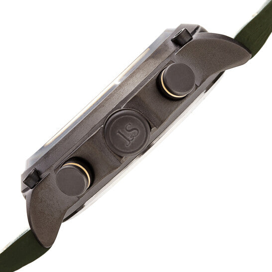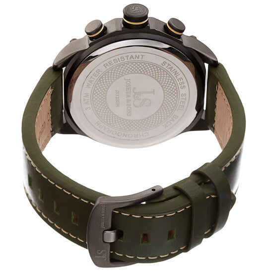 Composite metal case with a green leather strap. Fixed composite metal bezel. Grey dial with luminous black hands and index hour markers. Minute markers around the outer rim. Dial Type: Analog. Luminescent hands and markers. Chronograph - four sub-dials displaying: 60 second, 60 minute 1/10th of a second and 12 hour. Quartz movement. Scratch resistant mineral crystal. Pull / push crown. Solid case back. Round case shape. Case size: 48 mm. Case thickness: 14 mm. Band width: 22 mm. Band length: 8 inches. Tang clasp. Water resistant at 30 meters / 100 feet. Functions: chronograph, hour, minute, second. Fashion watch style. Joshua and Sons Chronograph Quartz Grey Dial Men's Watch JX133GN.