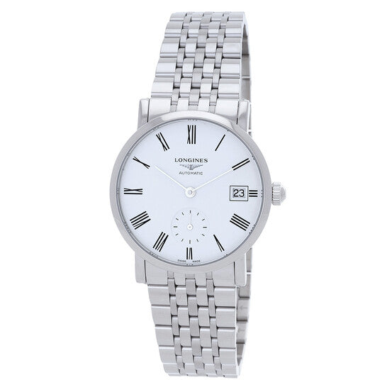 Silver-tone stainless steel case and bracelet. Fixed silver-tone stainless steel bezel. White dial with silver-tone hands and Roman numeral hour markers. Dial Type: Analog. Date display at the 3 o'clock position. Longines Calibre L891 automatic movement. Scratch resistant sapphire crystal. Transparent see through case back. Round case shape, case size: 34 mm. Deployment with push button release clasp. Water resistant at 30 meters / 100 feet. Functions: date, hour, minute, second. Additional Info: original box, international warranty card, manual (complete accessories). Elegant Series. Luxury watch style. Watch label: Swiss Made. Longines Elegant Automatic White Dial Ladies Watch L4.312.4.11.6.