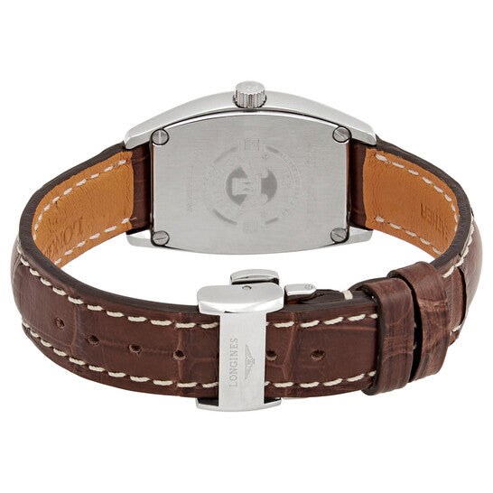 Stainless steel case with a brown (alligator) leather strap. Fixed stainless steel bezel. Silver dial with black hands and Roman numeral hour markers. Minute markers around the outer rim. Dial Type: Analog. Date display above the 6 o'clock position. Longines calibre L152 quartz movement. Scratch resistant sapphire crystal. Pull / push crown. Solid case back. Tonneau case shape. Case dimensions: 26 mm x 30.6 mm. Case thickness: 7.8 mm. Band width: 14 mm. Fold over clasp with a safety release. Water resistant at 30 meters / 100 feet. Functions: date, hour, minute, second. Evidenza Series. Dress watch style. Watch label: Swiss Made. Longines Evidenza Quartz Silver Dial Ladies Watch L2.155.4.71.9.