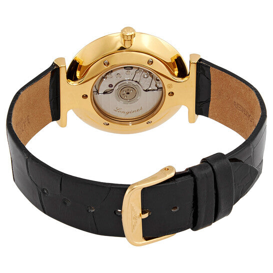 Gold PVD stainless steel case with a black leather strap. Fixed gold PVD bezel. White dial with black hands and Roman numeral hour markers. Dial Type: Analog. Longines caliber L593 automatic movement. Scratch resistant sapphire crystal. Pull / push crown. Transparent case back. Round case shape. Case size: 34 mm. Case thickness: 7.5 mm. Band width: 18 mm. Tang clasp. Water resistant at 30 meters / 100 feet. Functions: hour, minute. La Grande Classique Series. Dress watch style. Watch label: Swiss Made. Longines La Grande Classique Automatic White Dial Ladies Watch L47082112.