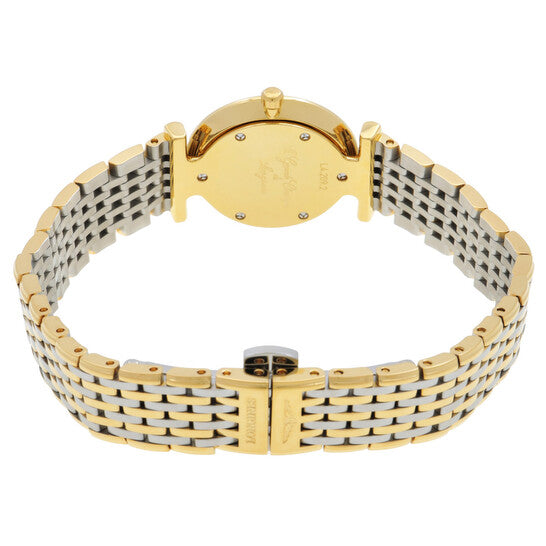 Stainless steel and yellow PVD coating case with a two-tone (silver-tone and yellow PVD) stainless steel bracelet. Fixed gold-tone stainless steel bezel. White dial with black hands and Roman numeral hour markers. Dial Type: Analog. Longines Calibre L209 quartz movement. Scratch resistant sapphire crystal. Pull / push crown. Solid case back. Round case shape, case size: 24 mm, case thickness: 4.30 mm. Band width: 13 mm. Water resistant at 30 meters / 100 feet. Functions: hour, minute. La Grande Classique Series. Dress watch style. Watch label: Swiss Made. Longines La Grande Classique Quartz White Dial Ladies Watch L4.209.2.11.D.
