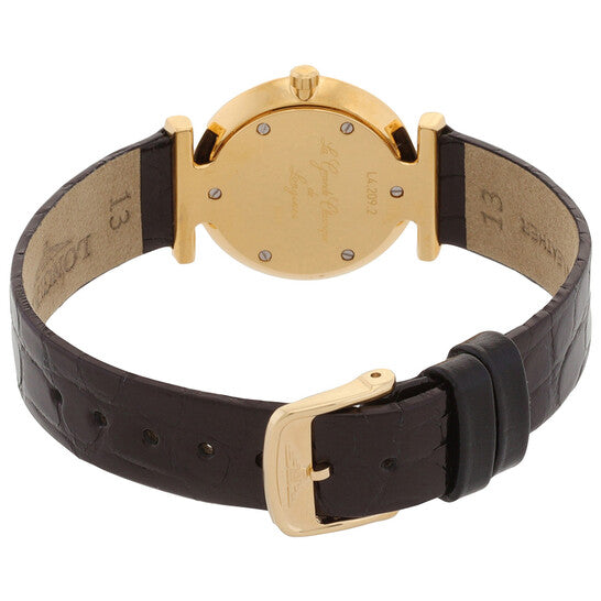 Yellow gold-tone stainless steel case with a black leather strap. Fixed yellow gold-tone stainless steel bezel. White dial with black hands and index hour markers. Dial Type: Analog. Longines Calibre L209 quartz movement. Scratch resistant sapphire crystal. Solid case back. Round case shape, case size: 24.5 mm. Buckle clasp. Water resistant at 30 meters / 100 feet. Functions: hour, minute. Additional Info: original box, international warranty card, manual (complete accessories). La Grande Classique Series. Luxury watch style. Watch label: Swiss Made. Longines La Grande Classique Quartz White Dial Ladies Watch L4.209.2.12.2.