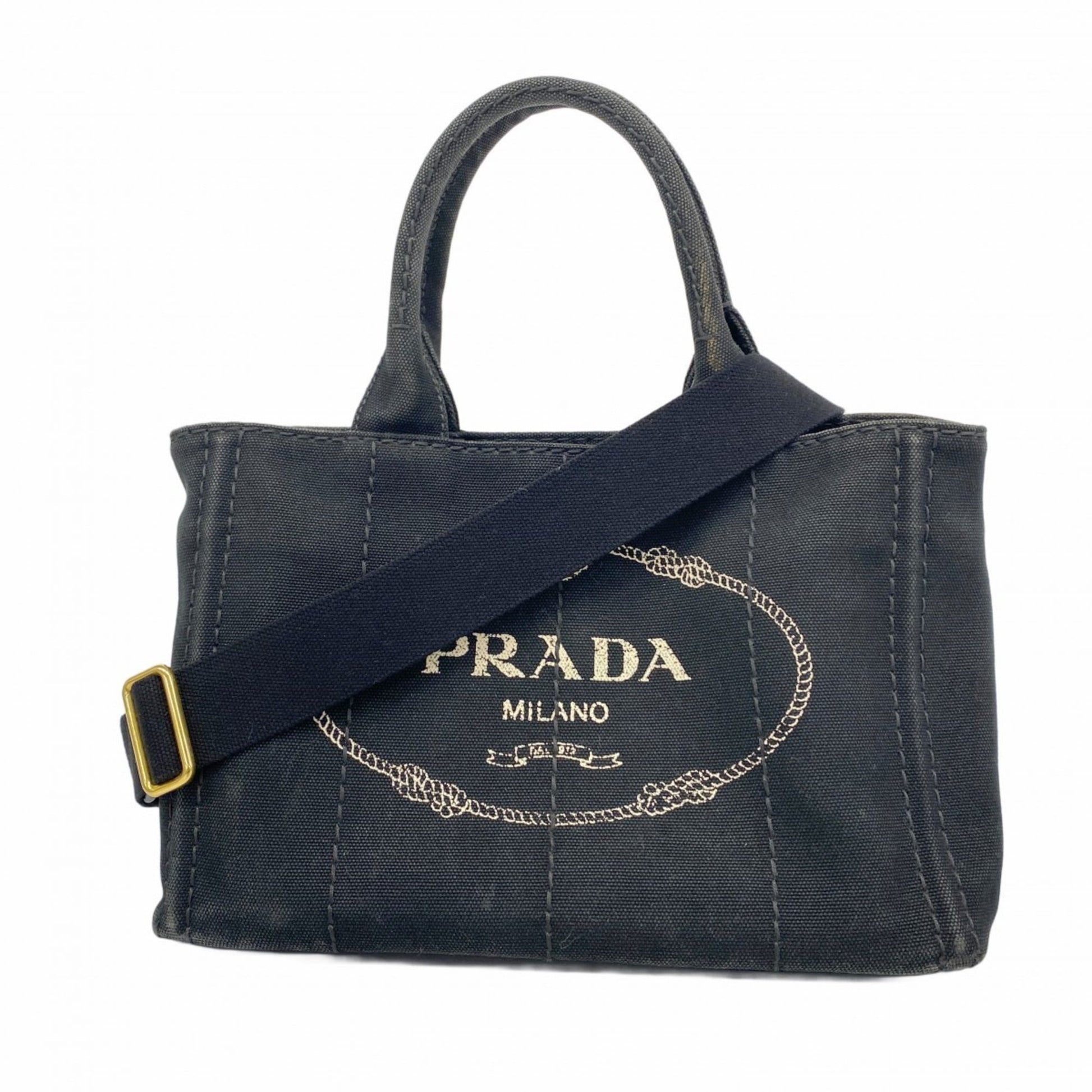 Brand: Prada, Color: Black, Material: Canvas, Dimensions: 19cm x 29cm x 16cm / 7.48'' x 11.41'' x 6.29'', Condition: Rank AB. Rank AB Used - Traces of usage, scratches / dirt can be seen but generally in good condition. Before purchasing, please refer to the images for the exact condition of the item. Before purchasing, please refer to the images of the accessories included with the item. Bag Common Damage Scratch: Slight